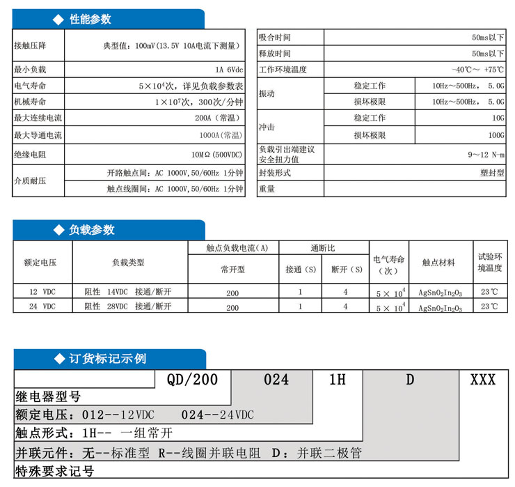 特性: · ●200A触点切换能力 · ●具有一组常开触点形式 · ●工作温度高达75℃ · ●可搭配选用二极管或电阻 · ●符合RoHS、ELV指令 典型应用: 用于汽车电源控制、启动装置、预热装置。